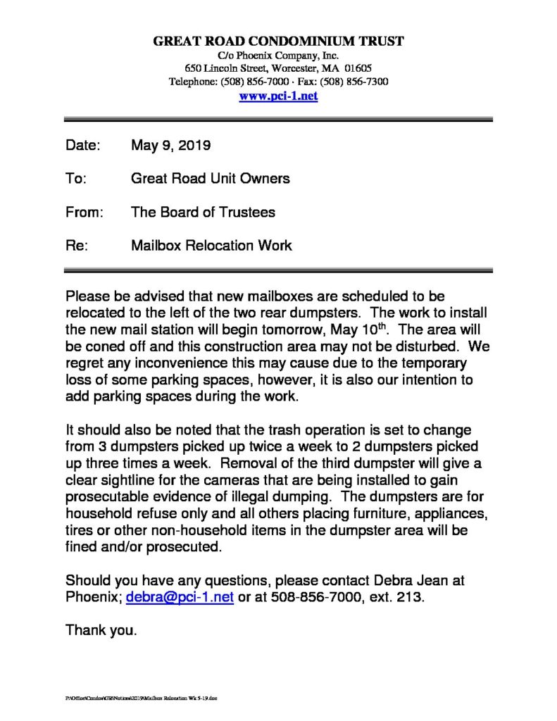 Mailbox Relocation-work starts 5/10/2019 by lynne | May 10, 2019 | Uncategorized | 0 comments Submit a Comment Cancel reply Your email address will not be published. Required fields are marked *Comment Name * Email * Website